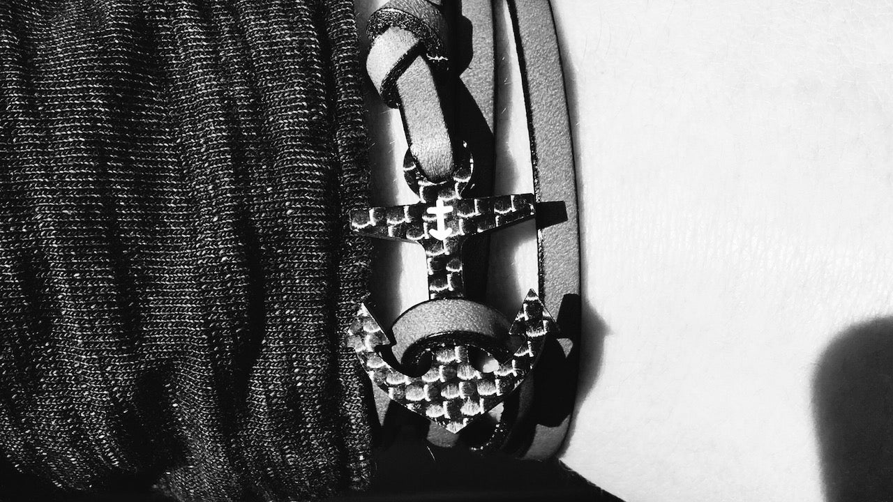 Es war 2015 als wir aus einer Skizze heraus kleine Anker aus dem Material Carbon schneiden ließen und sie mit schwarzem Lederband kombinierten.